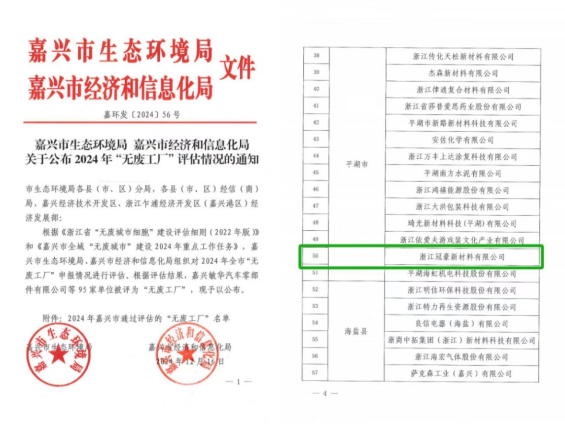 近日,嘉兴市生态环境局和经信局正式公示了2024年“无废工厂”名单,浙江冠豪顺利通过评审,成功获评“无废工厂”称号。